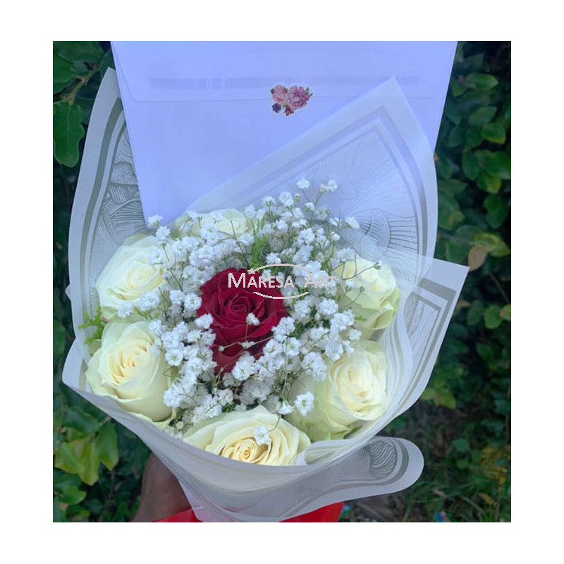 Bouquet de 09 roses blanches et 01 rose rouge au cœur du bouquet.Options: ******* 1- Carte avec message imprimé sans enveloppe 2- Carte avec message imprimé introduite dans une enveloppe NB: en plus du bouquet réservé, ajoutez l'une des options (1) ou (2) dans votre panier pour nous permettre de comprendre rapidement votre préférence;...
